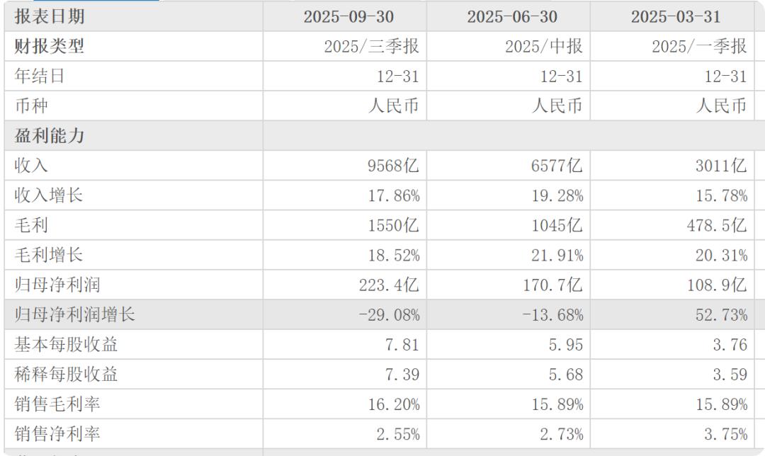 京东营收大幅增长,因外卖等新业务的亏损影响,京东2025年前三季度的毛利率略有提升的情况下,净利率下滑较大,由上一年同期的4.16%下滑至2.55%,这对单季度营收近3000亿元的京东来说,每下滑0.1个百分点都是不小的损失。