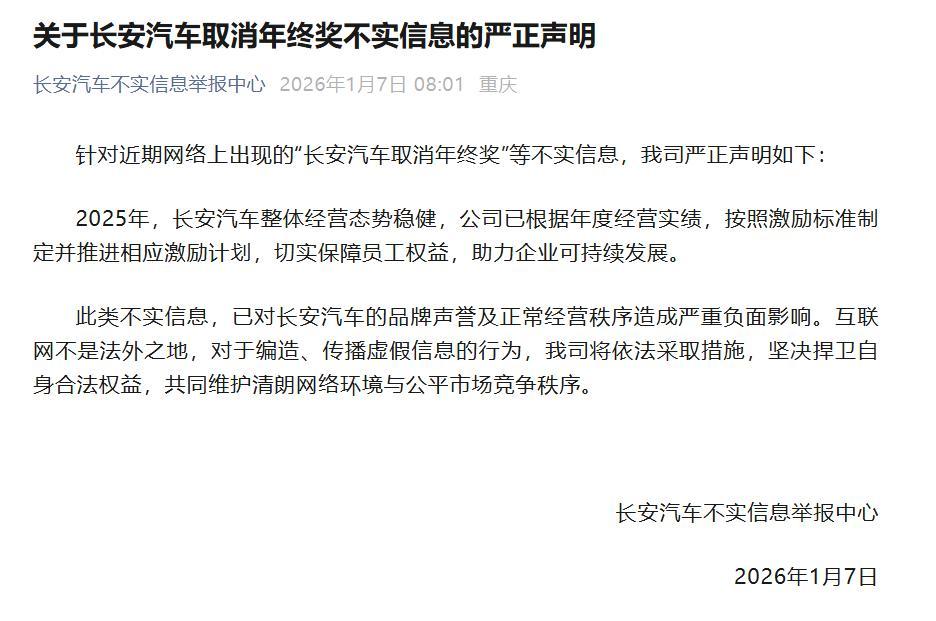 这让不少网友感到错愕,毕竟长安汽车年度销量目标完成率超过97%,在汽车行业中已属不错的表现。随后长安汽车紧急回应称消息不实,2025年长安汽车整体经营态势稳健,公司已根据年度经营实绩,按照激励标准制定并推进相应激励计划。
