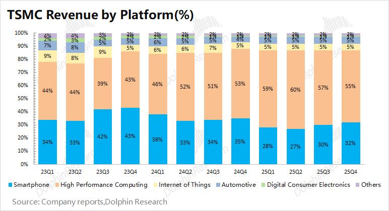 - b.下游应用端:公司本季度收入环增主要来自于手机业务,因iPhone新机出货。在英伟达、博通等AI芯片需求的影响下,高性能计算依是公司最大的收入来源,本季度达到185.5亿美元,收入占比55%。