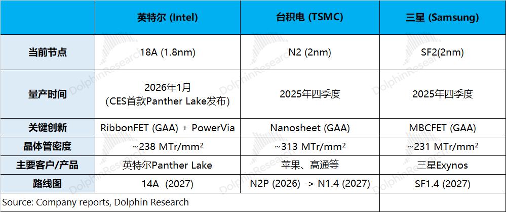 - c)代工市场的竞争:在台积电2nm开启量产之后,三星和英特尔也紧跟着分别进入了SF2(2nm)和18A(1.8nm)节点。