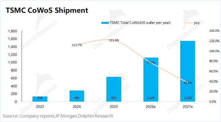 结合行业数据及市场预期,台积电当前CoWoS的月产能约7万片左右,至2026年末有望扩大至12万片左右。海豚君预估2026年台积电CoWoS的出货量有望达到110万片以上,同比增长77%,其中英伟达、AMD和博通是最主要的客户。