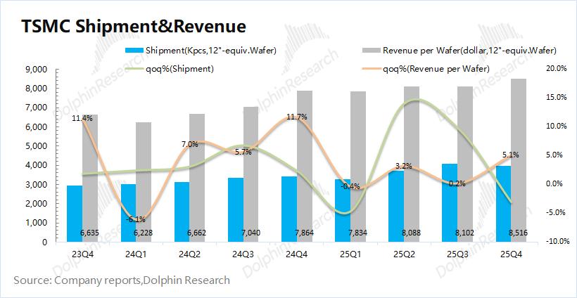 1)量的维度:2025Q4台积电的晶圆出货量3961千片,环比下滑3%,受到2nm量产初期的产能调整等因素影响。公司将2026年的资本开支目标上调至520-560亿美元,再度增加110-150亿美元。大幅提升的资本开支,是公司持续扩产的明确信号。