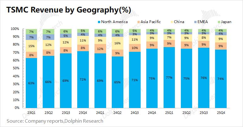 从各地区收入来看,北美地区仍是台积电最大的收入来源,收入占比为74%。这是由于北美地区有苹果、英伟达、AMD、高通等大客户,使得台积电和美国之间有很强的商业绑定关系。