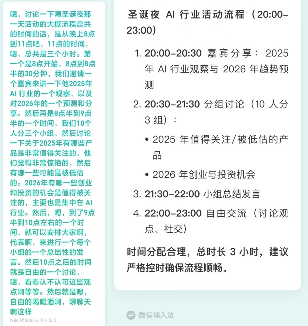 *左图:微信输入法语音转文字的内容;右图:“问AI”一键整理后的内容