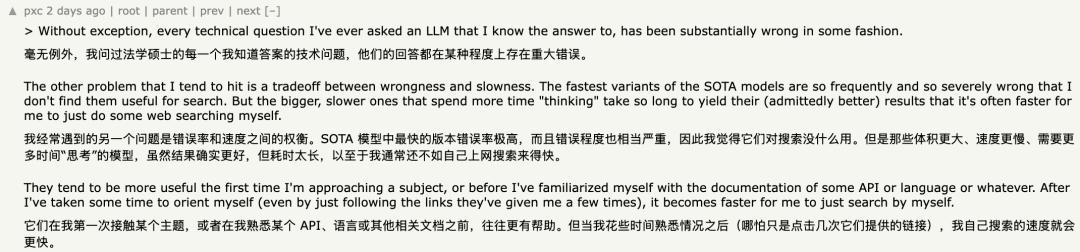 在我刚开始接触某个新领域,或者还没完全熟悉某个 API、语言或相关文档之前,这些模型确实能发挥一定作用。但一旦我花了些时间完成“入门”,哪怕只是顺着它们给出的链接自己看过几次资料,后续再查问题时,直接自己搜索反而更高效。”