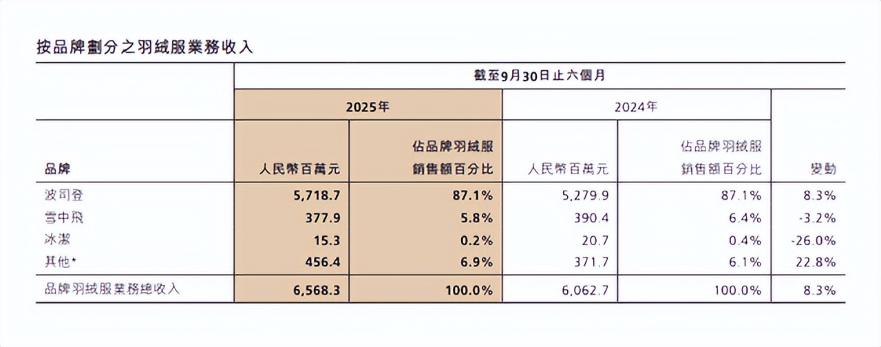根据波司登2025/26年中期报告显示,截至2025年9月30日,雪中飞占品牌羽绒服销售额百分比为5.8%,而冰洁更差,占比仅为0.2%。而且比起2024财年同期,雪中飞和冰洁的收入还出现了下滑,下滑幅度分别为3.2%和26%。