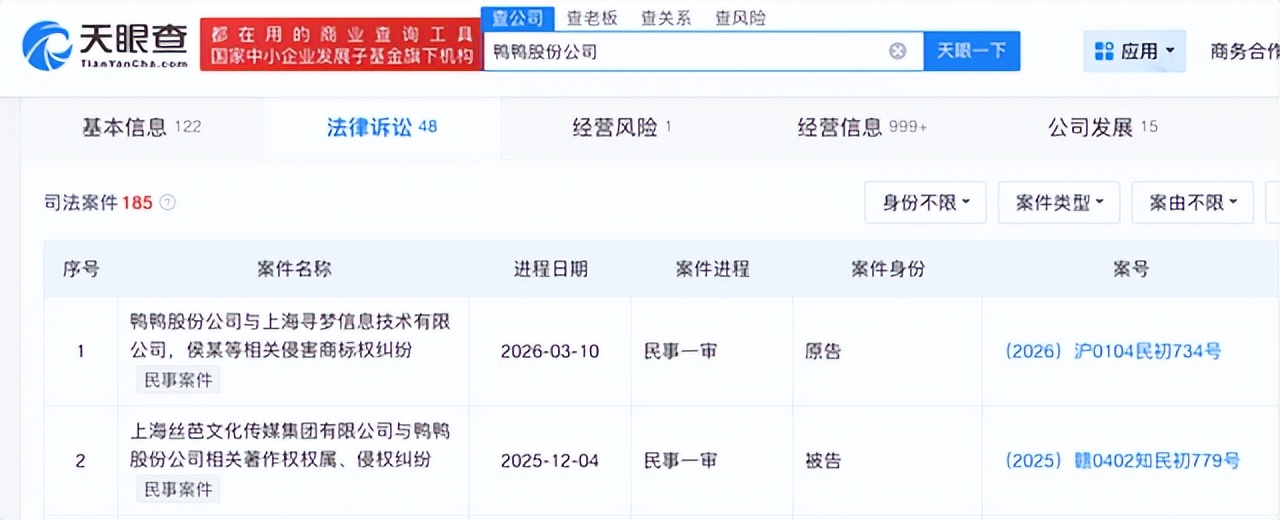天眼查APP数据显示,鸭鸭股份公司司法案件数量高达185件,其中最近的两起案件均涉及商标权或著作权纠纷。