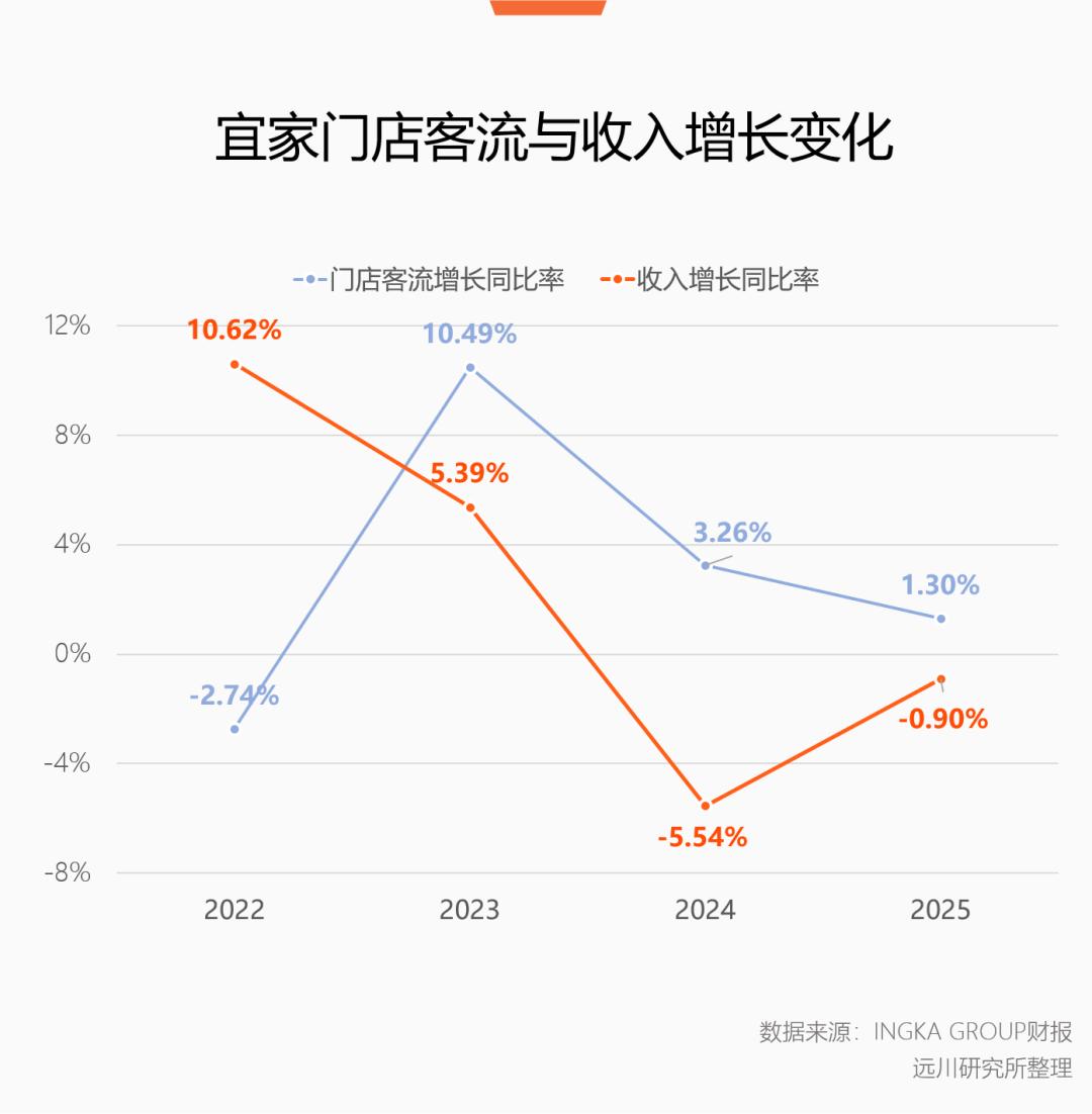 但在2025年,宜家的线下客流与销售数据呈现两极分化:门店客流量连续正增长,销售总额却连续两年下滑。