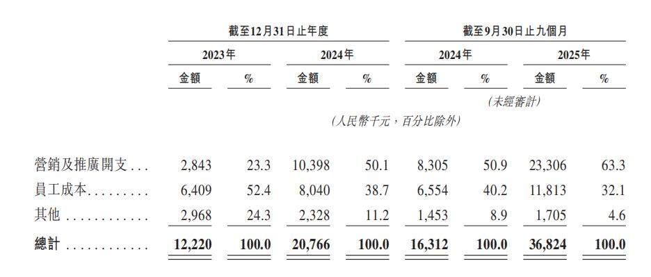 财务数据显示,桑尼森迪的营销推广开支从23年占总体的23%左右一路高涨到25年前三季度的63.3%。在详情中,公司表明对电商平台流量获取的重金投入导致了绝对值大幅上涨。