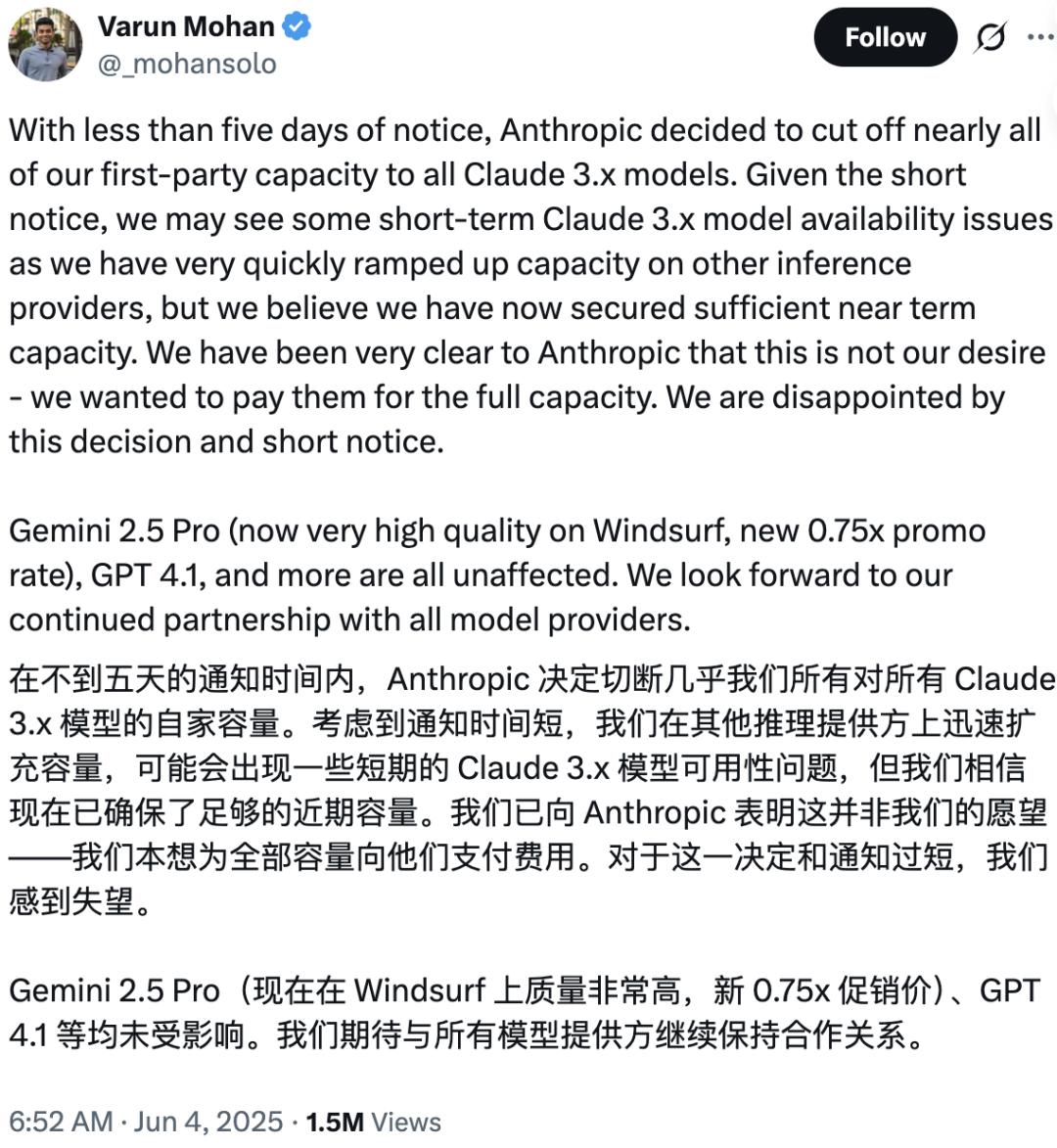 Windsurf的CEO表示,Anthropic的变动没有提前通知该公司,现在该初创企业必须寻求其他第三方计算提供商。