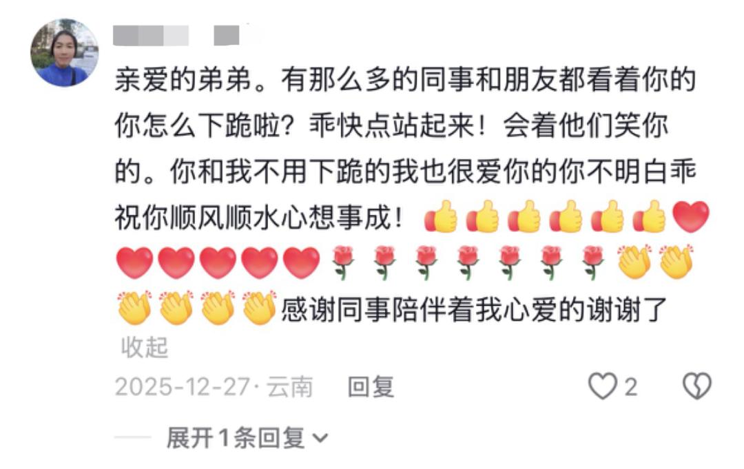 “亲爱的弟弟,有那么多同事和朋友看着你,你怎么下跪啦?”“乖快点站起来,不用下跪我也很爱你的”。