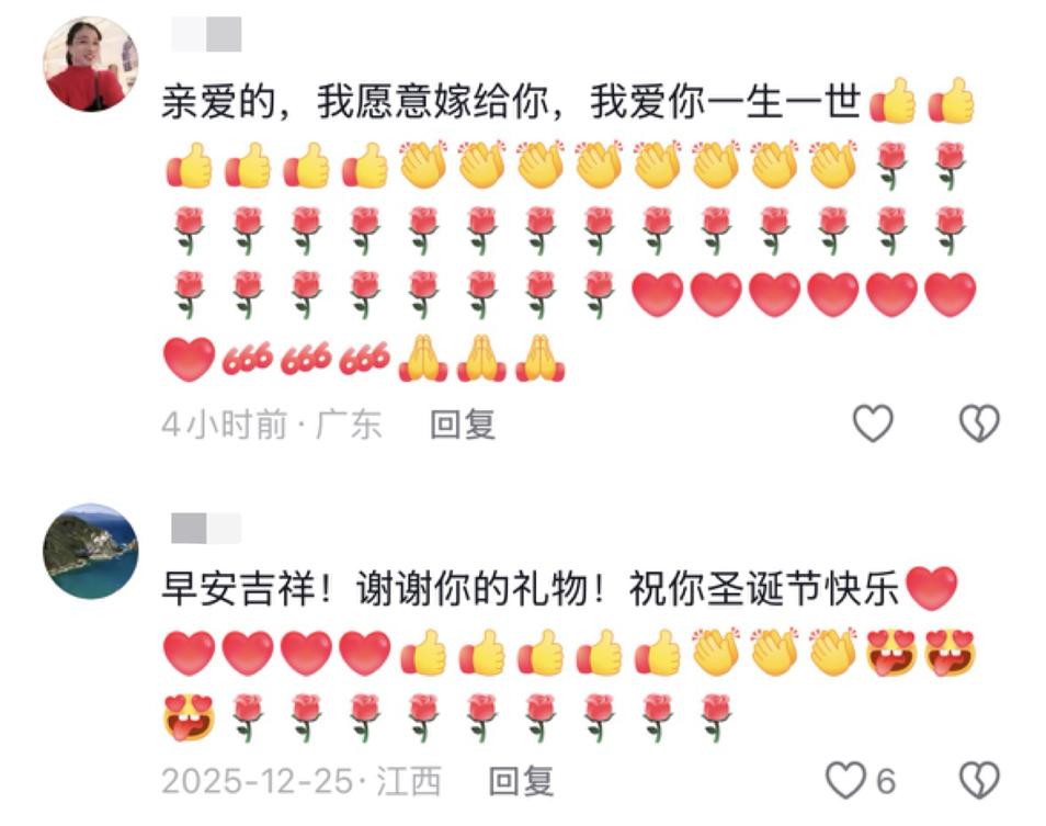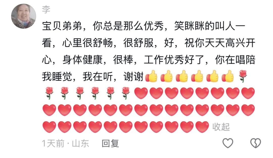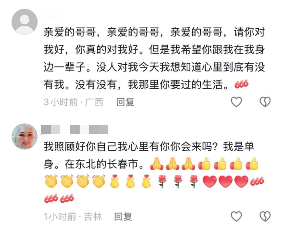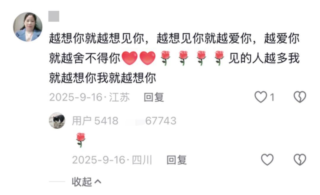 为啥呢?可能是大姨们并不认识字,她们通过语音转文字回复的功能,把那些情话一股脑倾倒在评论区里,不标准的普通话转成文字之后也是病句,透着一种笨拙的真诚。