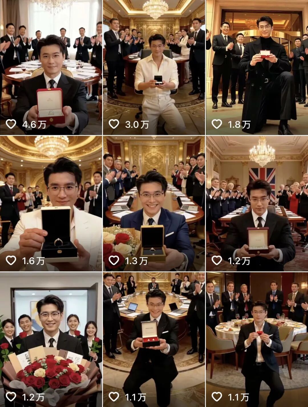 无论场景怎么换,老罗的表演始终如一:他穿着一身笔挺西装,在一众长得几乎一模一样的黑衣保镖簇拥下,深情款款地走向镜头,掏出一个超大钻戒,单膝下跪。