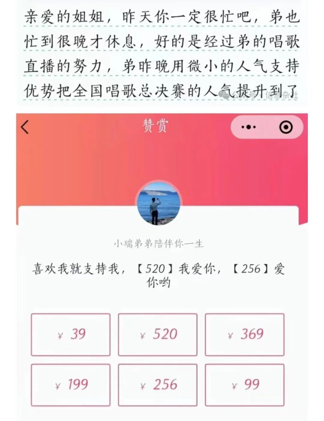 还有更直接的方法就是直接问大姨们要钱喽。常见的话术是自己正在和别人打 PK,很快要输了,急需姐姐们的金钱支持,“帮帮我嘛,我输了的话又要被惩罚”“我今天生日,你一定要来给我助力哦”。