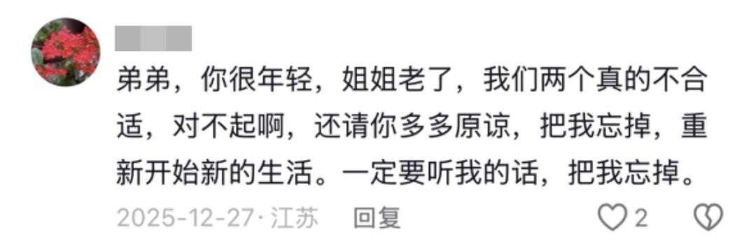 这位大姨就很理智,明白这是一段禁忌之恋,含情脉脉地拒绝了他,“还请你多多原谅,把我忘掉”“一定要听我的话,把我忘掉”。