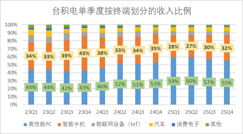 从收入占比结构来看,第四季度智能手机占收入的32%,HPC占收入的55%,二者累计贡献了台积电87%的收入,与前三季度持平。