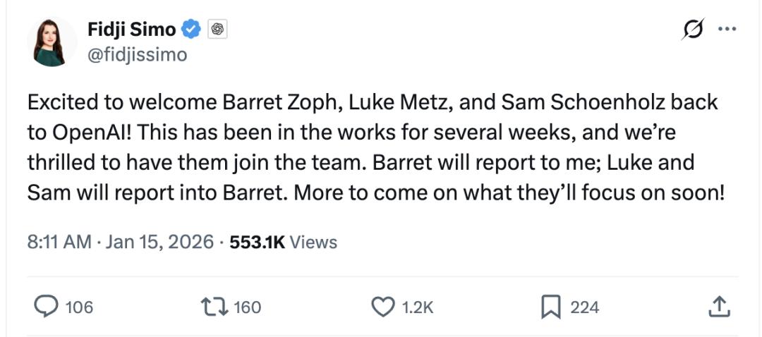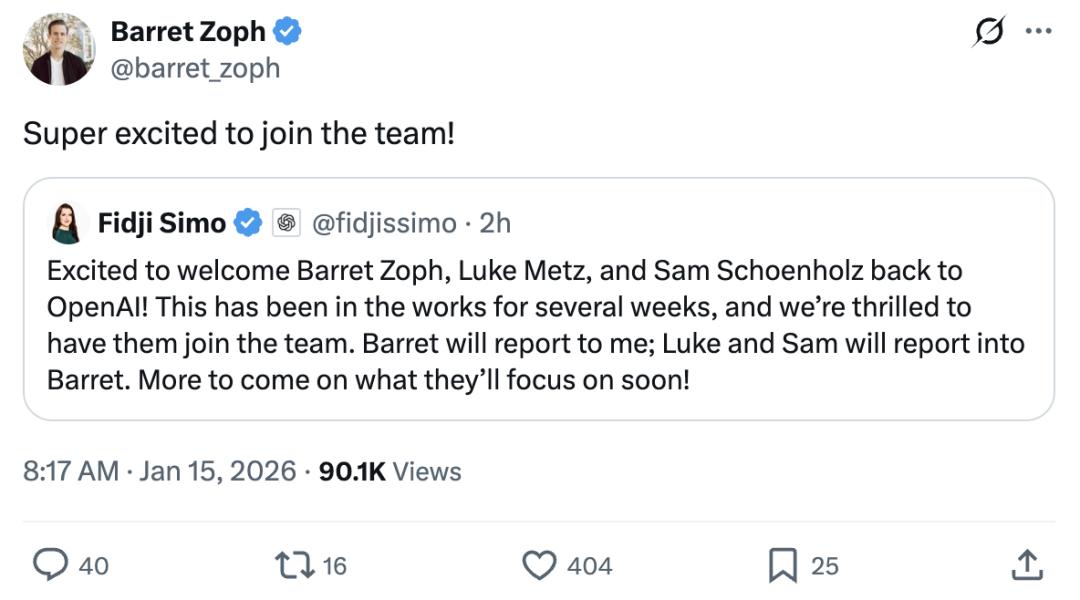 很高兴欢迎Barret Zoph、Luke Metz和Sam Schoenholz重返OpenAI!这项安排已经筹备了数周,我们非常期待他们加入团队。Barret将直接向我汇报;Luke和Sam将向Barret汇报。关于他们接下来将重点负责的方向,很快会有更多消息公布。