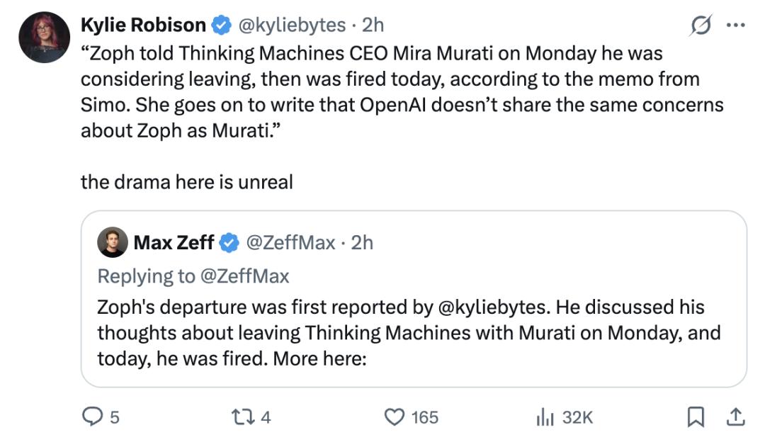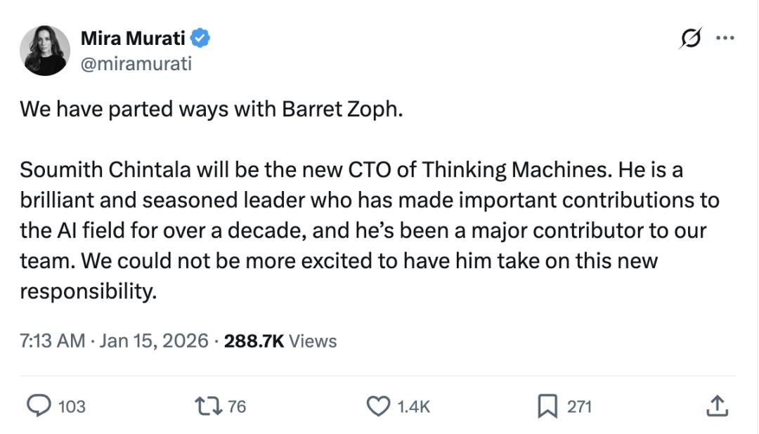 Thinking Machines Lab CEO Mira Murati火速发推表示(就隔了20分钟):