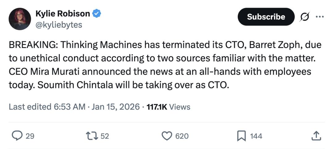 Thinking Machines已因不道德行为开除其首席技术官(CTO)Barret Zoph。公司CEO Mira Murati已于今日在员工全员大会上宣布了这一消息。Soumith Chintala将接任CTO一职。