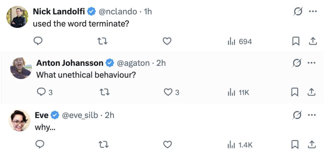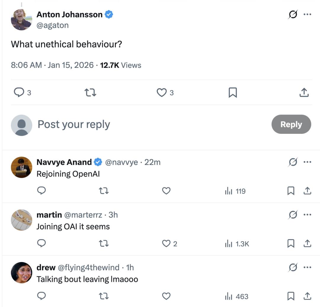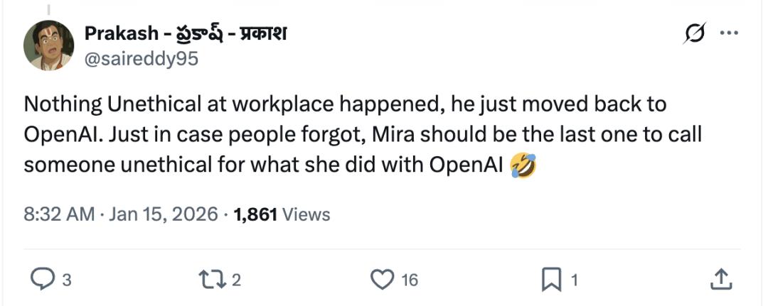 并没有发生任何“职场不道德行为”,他只是回到了OpenAI而已。以防有人忘了,考虑到Mira当初在 OpenAI 的所作所为,她大概是最没资格指责别人“不道德”的那个人了