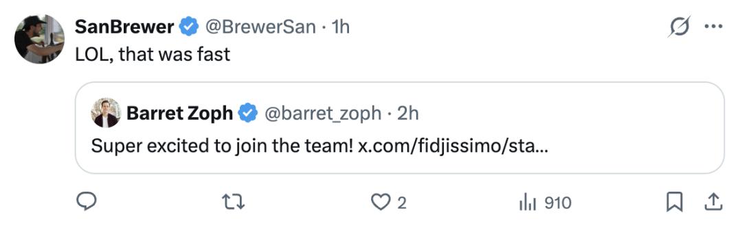 紧接着,Barret Zoph转发了这条消息,并表示对重返团队感到非常激动。
