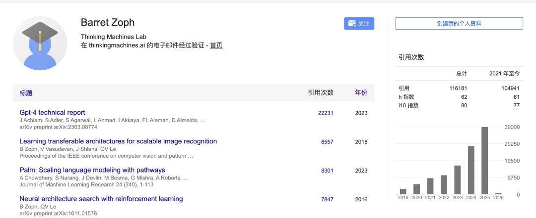 在加入OpenAI之前,Zoph还于2016年至2022年8月加入Google Brain担任研究科学家,专注于训练大型稀疏语言模型、神经架构搜索 (NAS) 和AutoML应用,其工作被引用超过11万次。