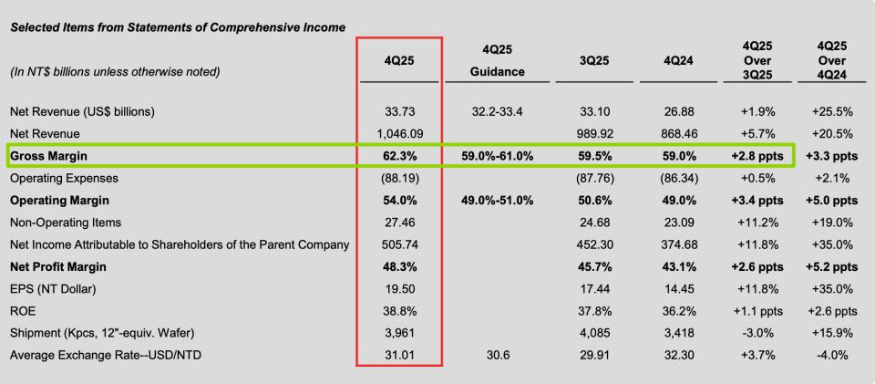 第四季度,台积电还有一个关键的数据披露,毛利率冲破60%,达到62.3%,而之前的指引是59%-61%,直接超了指引的上限1.3个百分点。