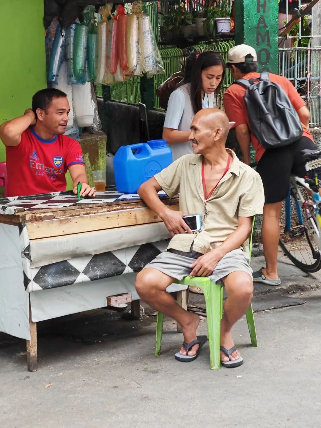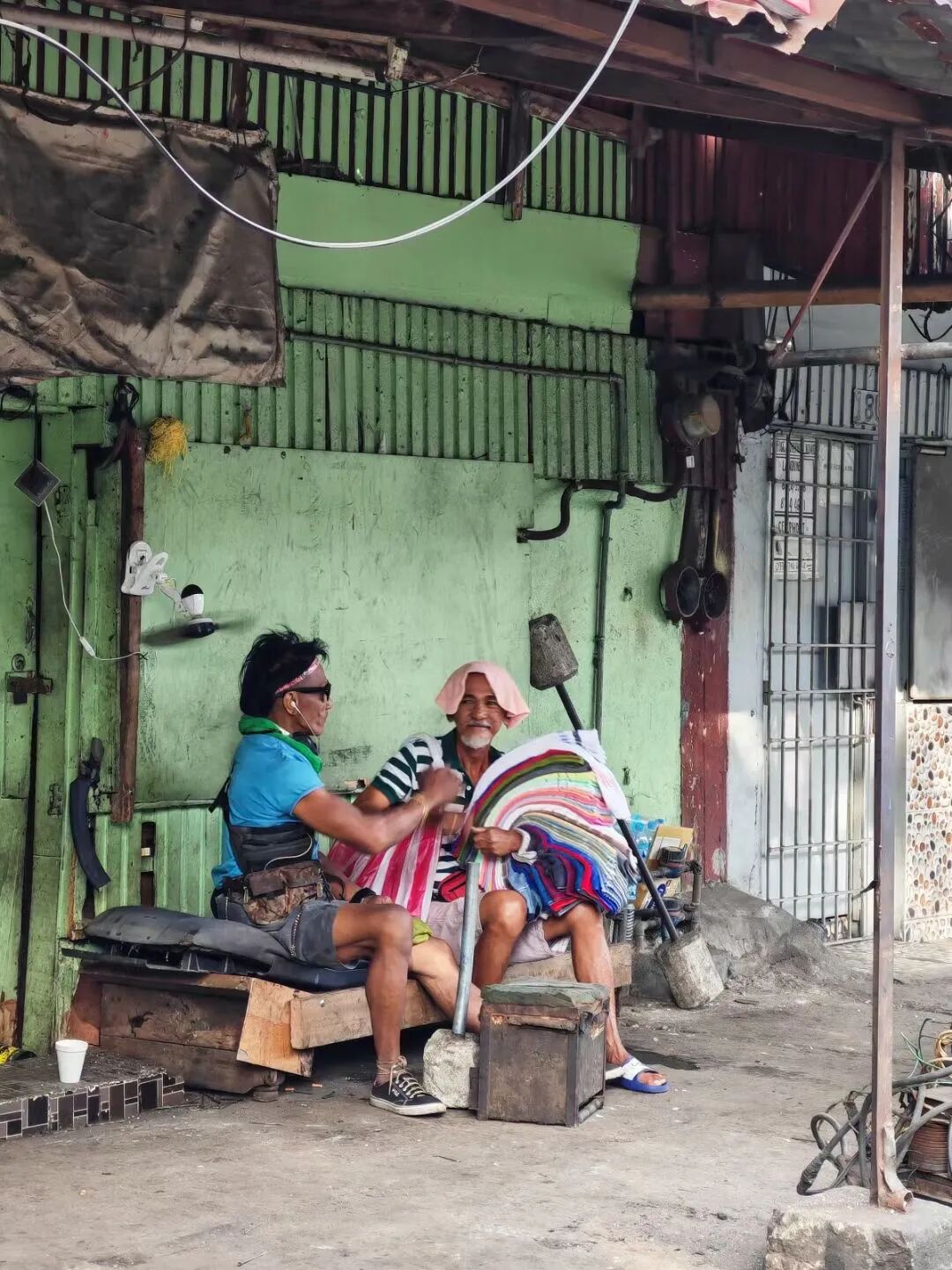 彼此不忙的时候,就聊聊天。 可以是日常琐碎,是取财之道,是其他任何。 他们的心态很好。 几个塑料瓶盖,就可以快乐很长时间。