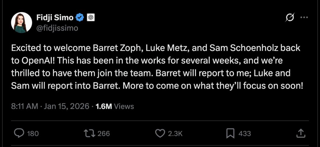 OpenAI 应用部门 CEO Fidji Simo 同样在 X 平台发文,宣布欢迎 Barret Zoph、Luke Metz 以及 Sam Schoenholz “回归 OpenAI”,并明确表示这一安排“已筹备数周”。
