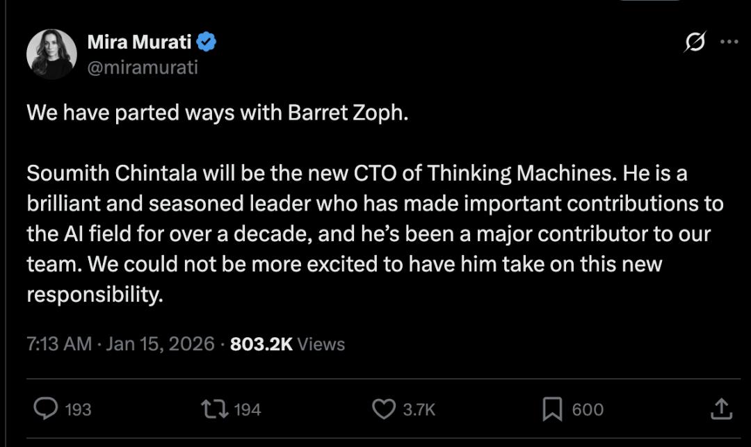 Wired 的相关报道指出,Zoph 与 Thinking Machines Lab 的分手“并不友好”。虽然报道并未披露具体冲突细节,但这一描述本身,已经与 Murati 在公开声明中所采用的克制措辞形成了明显对比。