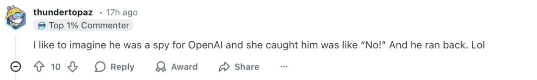 另一位用户用半开玩笑的语气说他“想象 Zoph 像是 OpenAI 的间谍,被抓住后跑回去了(笑)”,表明社区对事件背后动机的好奇与揣测。