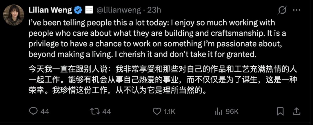 随着事情的发酵,Thinking Machines Lab 联合创始人、前 OpenAI 安全研究副总裁翁荔(Lilian Weng)也在 X 上发声了,她的发文中没有明确就此事展开评论,而是发了一些个人感慨: