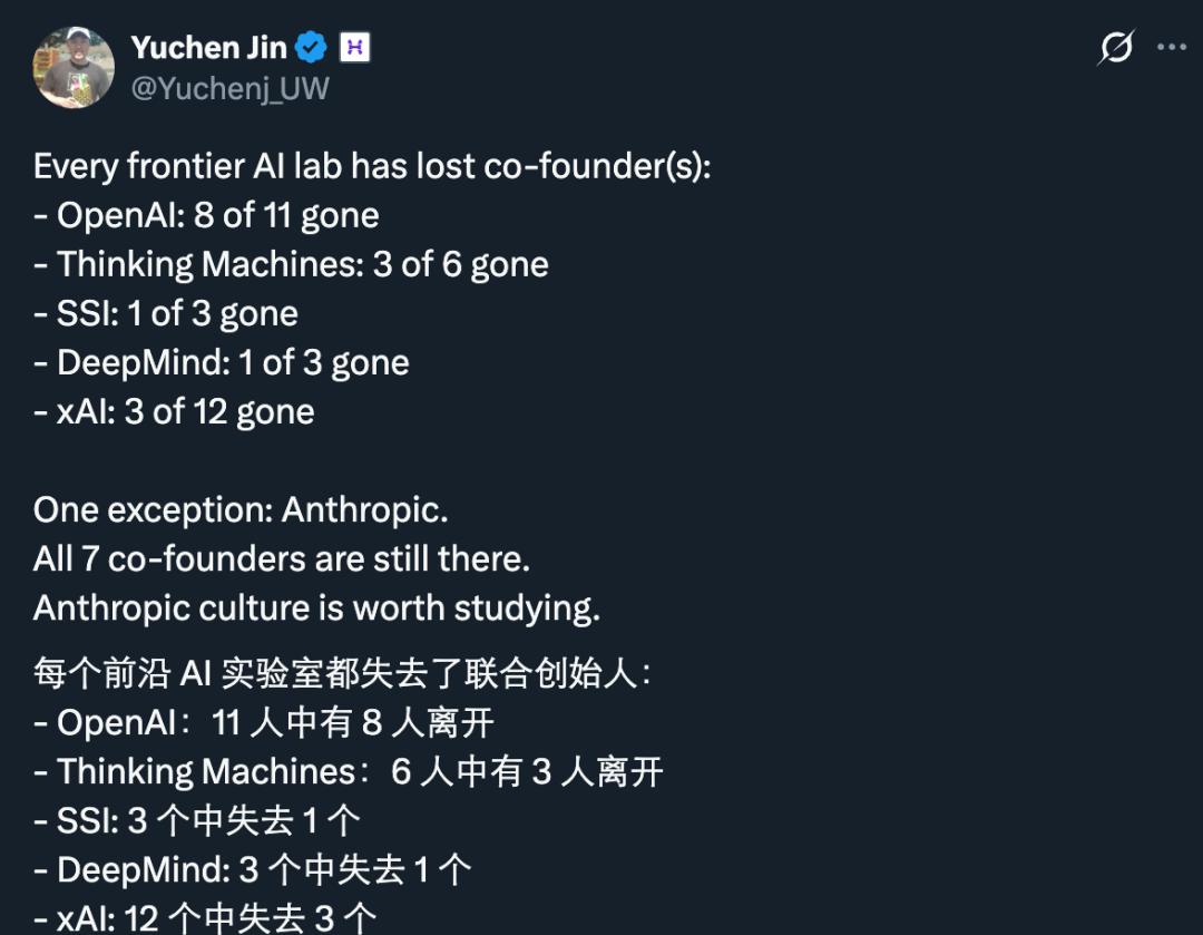不过,在失去「联创」这件事上,Thinking Machines Lab 倒也并不孤独,有人统计了最近几年头部 AI 公司的人员流动情况,发现联创出走比大家印象中还要频繁。