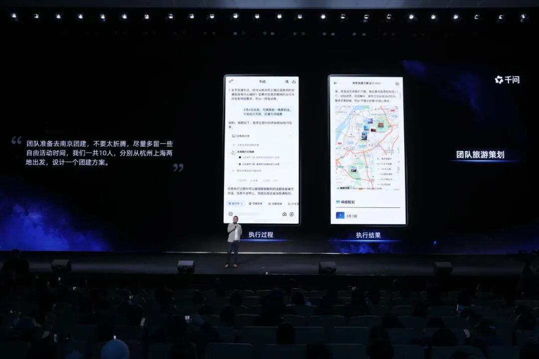 此外,千问的对于这些生态和结合并非简单的调用,作为首个能完成真实生活复杂任务的AI助手,千问拥有对复杂任务的规划能力。现场演示环节,在春节出游场景中,千问App完成了调用飞猪能力完成机票酒店的预定,调用高德的能力完成行程规划、年夜饭的预定。