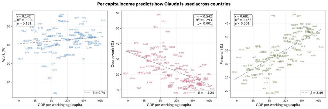 但在人均 GDP 较低的国家,Claude 最主要的角色是「老师」,大量的用途集中在课程作业和教育辅导上。