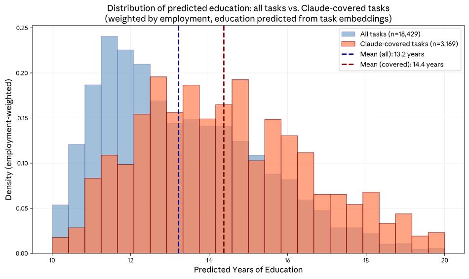 数据表明,Claude 目前覆盖的任务,平均需要 14.4 年的教育背景(相当于大专学位),远高于整体经济活动平均所需的 13.2 年。