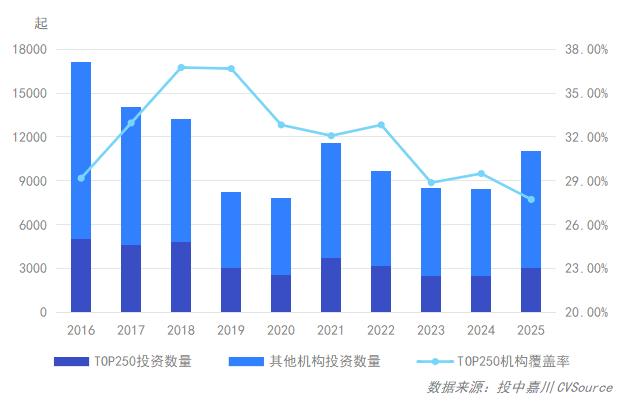 图9:2016年-2025年“Top 250”投资数量及市场覆盖率