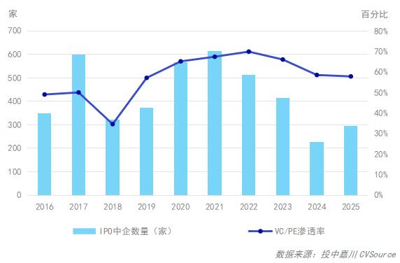 图18:2016年-2025年IPO方式退出VC/PE渗透率