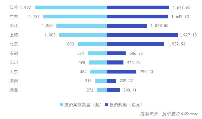 - 江苏投资交易数量连续多年领跑全国,上海持续坐稳最吸金城市宝座,北京凭借大额交易案例的集中分布凸显规模优势