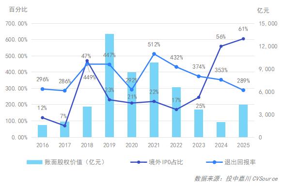 图19:2016年-2025年IPO退出账面股权价值及回报率
