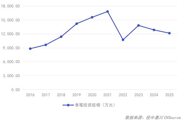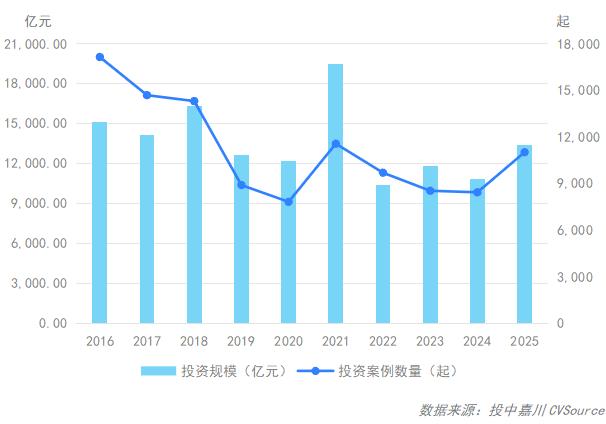 2025年,投资案例数量11,015起,同比上涨30.6%;投资规模13,396.8亿元,同比上升23.43%;投资均值1.22亿元,较去年小幅回落。整体来看,投资市场在2025年强势升温,投资数量再回超万起,本期投资交易数量及金额均接近近十年投资平均线。
