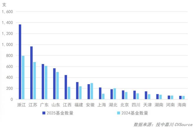 2025年,共计32个省市区(含港澳台)新设基金,其中,浙江省新设数量1,367支位居榜首,江苏省、广东省新设基金967支、644支紧随其后,浙江、江苏、江西、上海基金数量同比大幅增加,安徽省、湖北省同比小幅下行。