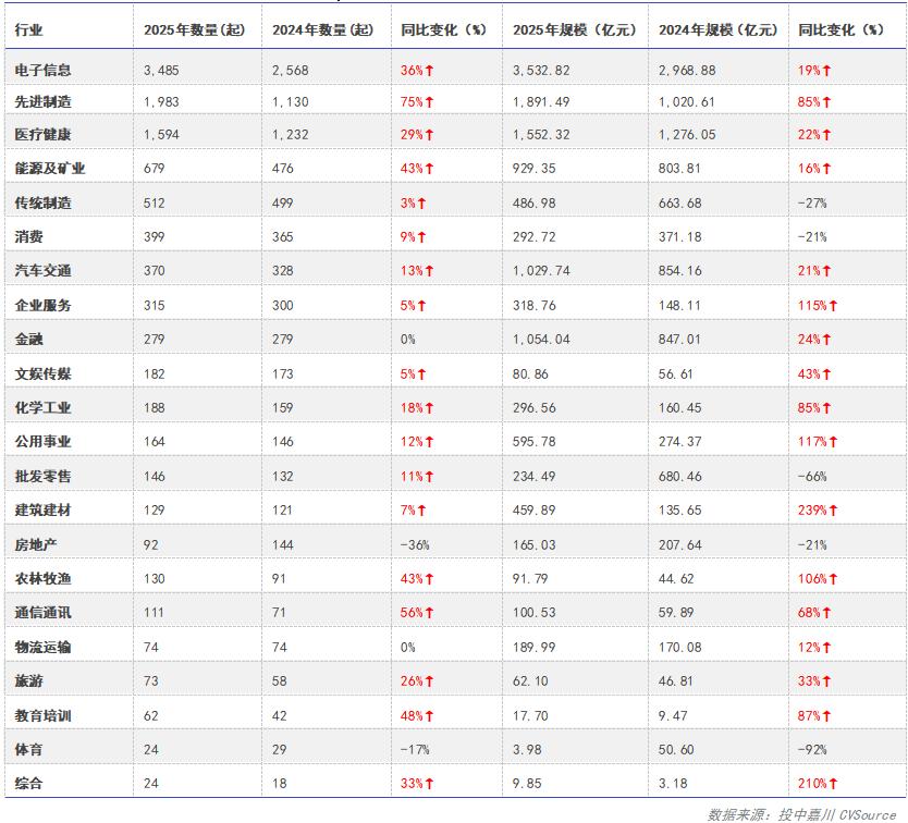 表7:2025年中国VC/PE市场各行业交易数量及规模同比概况
