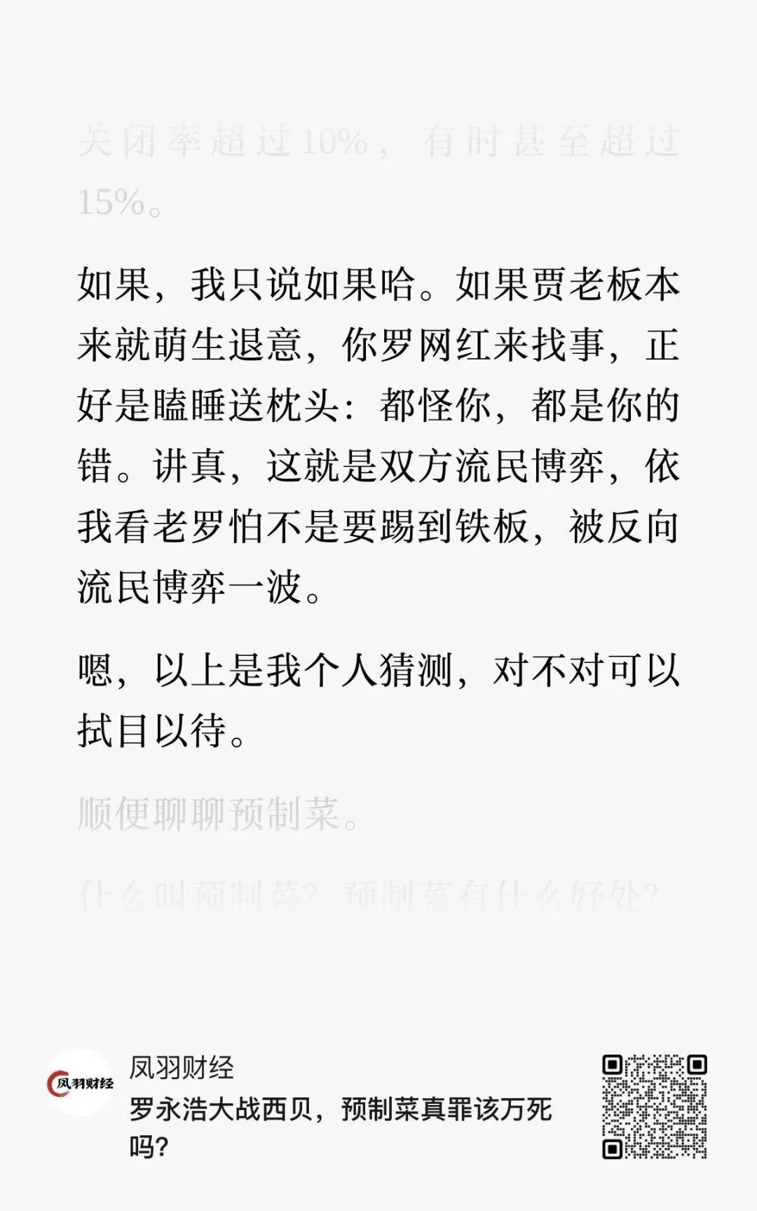 这是致命的信号。所以,如果从“战术层面”看,也许是老罗一条微博,引发了西贝的应激反应,继而导致今天贾老板的关店动作;但如果从“战略层面”看,更合理的解释只有一个:餐饮这个行业,正在发生深度重构,而用老方法经营的餐厅,正在被系统性淘汰。