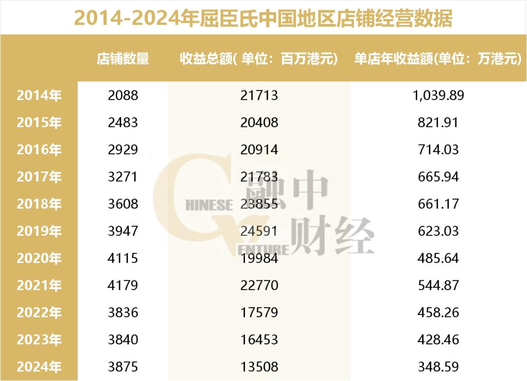 但盲目扩张导致单店效益断崖式下滑,如下图所示,2014年单店年收益为1039.89万港元,2020年腰斩至485.64万港元,2024年进一步跌至348.59万港元。