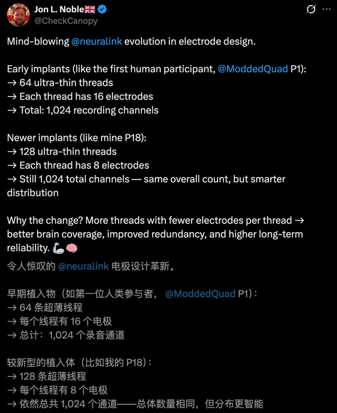 最关键的电极芯片的迭代。另一位英国BCI患者Jon L. Noble,介绍了自己和Noland植入物的一些差异。
