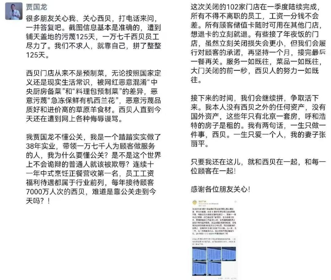 承认闭店消息的同时,贾国龙也透露出无奈和愤恨。“遭到铺天盖地的污蔑125天,一万七千西贝员工尽力了。”