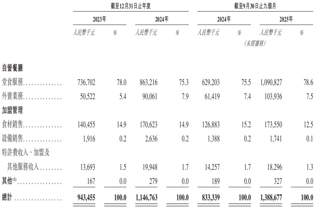 收入结构上,自营餐厅构成了主要业务支柱,占比近85%,其中堂食又为核心收入来源,2023年、2024年占比分别为78%、75.3%。公司的加盟收入主要包括食材、设备销售及特许费等。