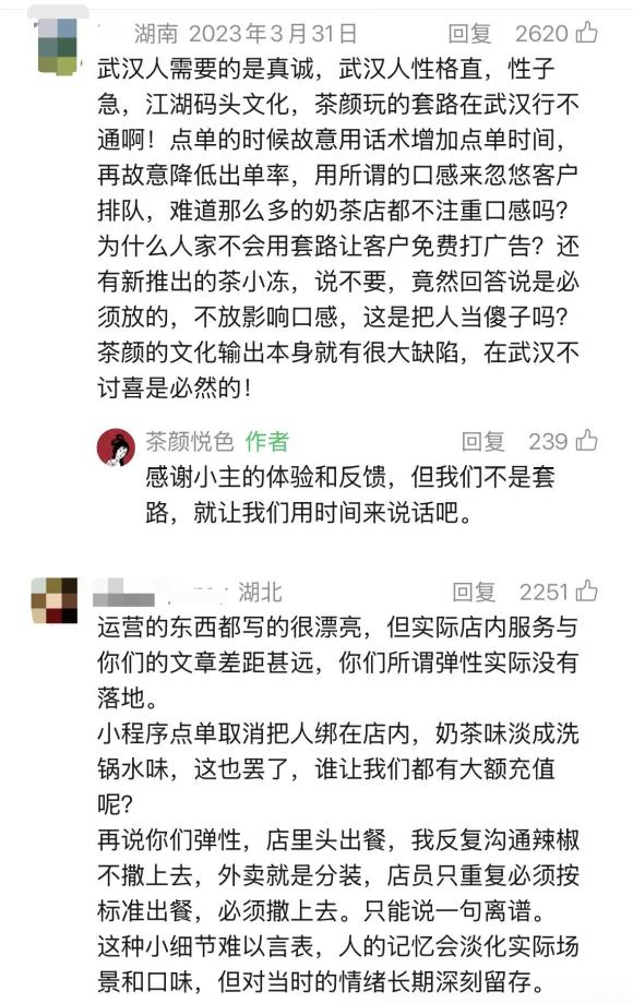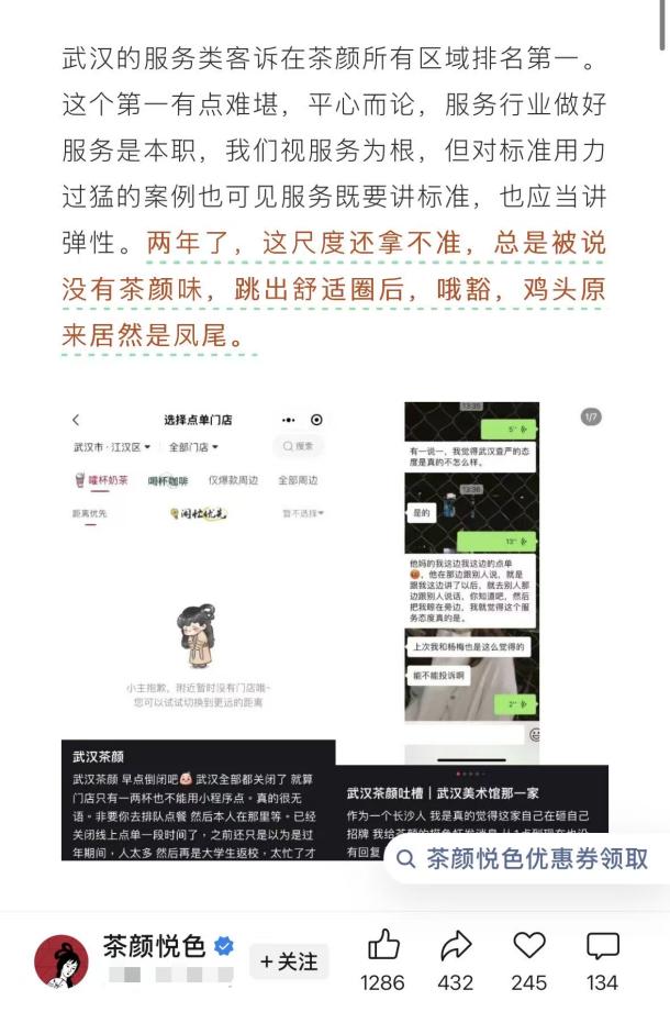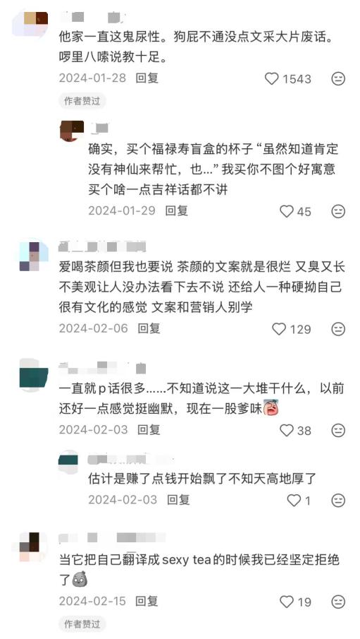 其次,茶颜悦色一向自豪于极具“活人感”的内容输出,但个人风格强烈在拉近一部分人距离的同时也难免招致另一部分人的不满。社交媒体上有不少认为茶颜悦色的过度输出像在说教用户,令人感到不适的吐槽。