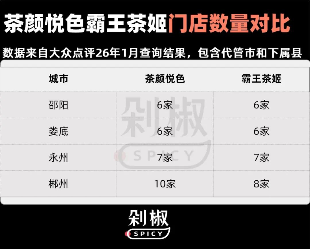 霸王茶姬进入永州的时间是24年7月,而茶颜悦色的永州首店在25年3月才开业。2025年,茶颜悦色在省内入驻了永州、邵阳、郴州和娄底四城,但这些湖南中小城市在迎来茶颜悦色之前已经更早拥有了霸王茶姬。目前,两个品牌在四城的门店数量也基本持平。